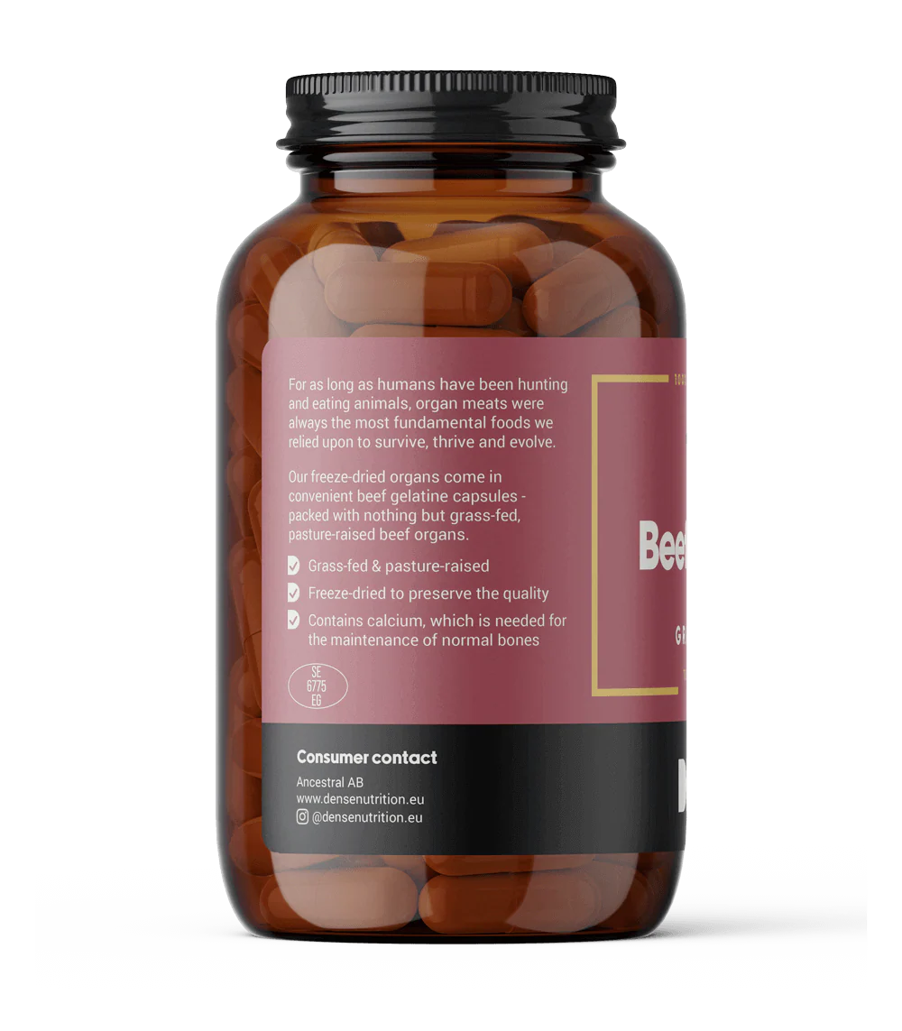 What we like: the formula is clean and specific. No fillers or preservatives—just organs and hydroxyapatite in gelatin capsules. The origin is also clear: grass-fed cattle from New Zealand, then filled and packaged in Sweden.