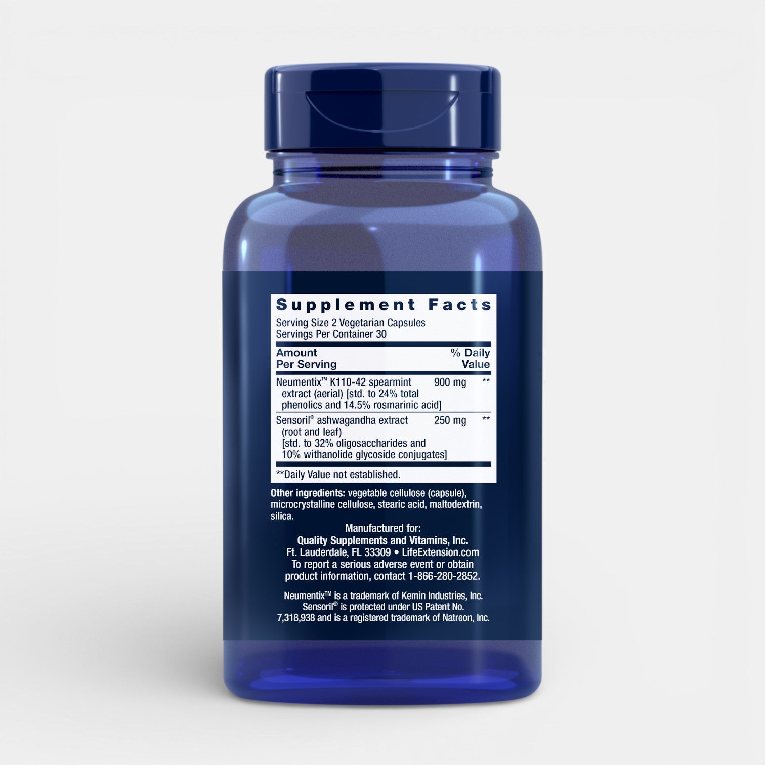 Ingrediënten: ashwagandha-extract (Withania somnifera) en aanvullende nutriënten volgens de formule van Life Extension, plus capsulemateriaal en hulpstoffen (zie etiket voor de volledige en actuele lijst).