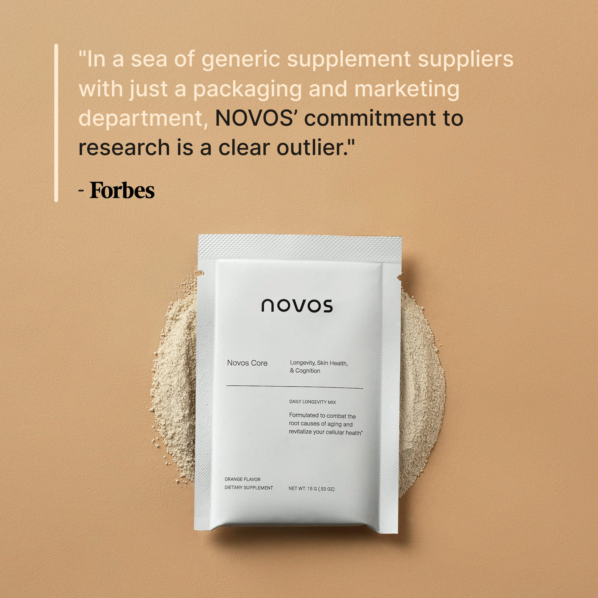 The composition of NOVOS Core is inspired by these areas of research. This doesn't mean the product can stop aging, but rather that the formula is designed with a broad, long-term approach to health in mind.